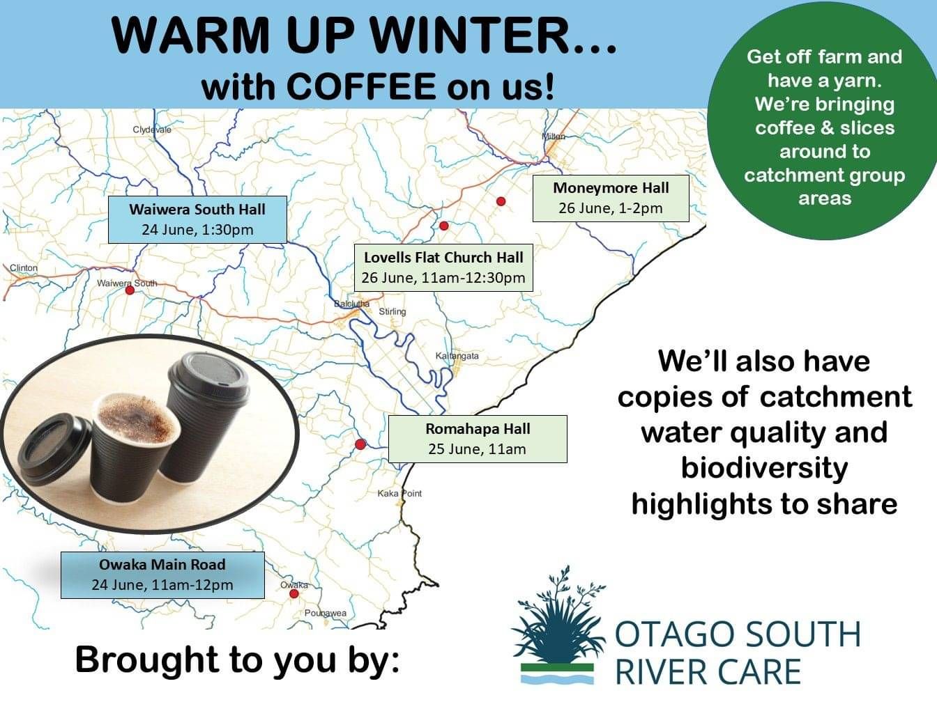 Get off farm and have a yarn. We're brining coffee and slices around to catchment group areas
